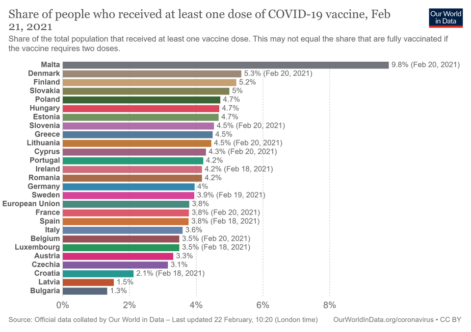 Но эта статистика показывает тех, кто получил хотя бы одну дозу вакцины. Если посмотреть, какая доля населения была привита дважды, расклад по Евросоюзу будет слегка другой. Мальта вновь обгоняет всех с 4 процентами, за ней идут Португалия (3,5 %) и Бельгия (3,3 %). Финляндия идет где-то в середине списка: две дозы вакцины получили 75 тысяч человек, то есть примерно 1,3 процента населения.