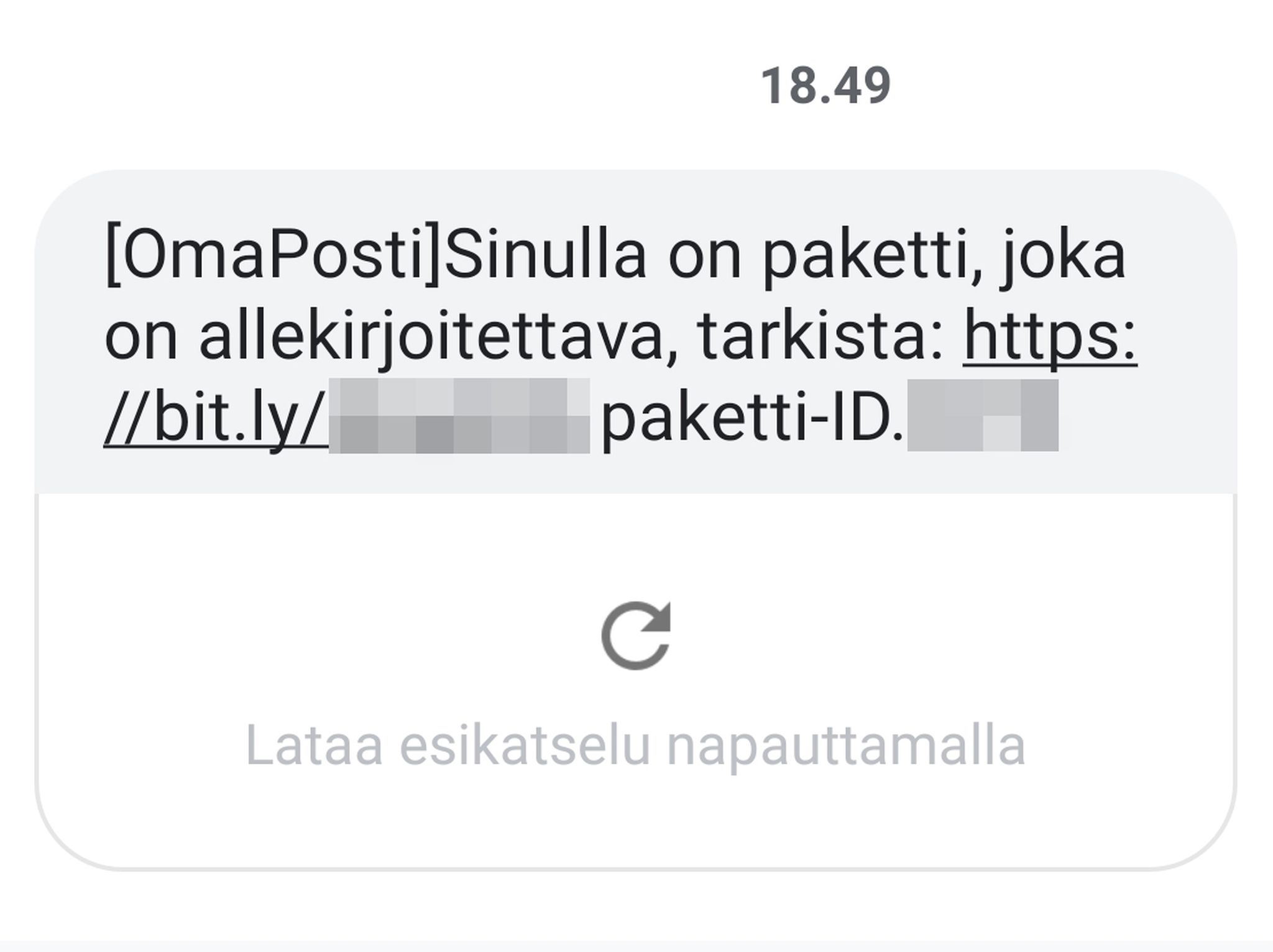 В мошенническом сообщении утверждается, что получатель получил пакет, который необходимо подписать. В начале сообщения подразумевается, что сообщение исходит от OmaPosti и содержит ссылку на сайт, замаскированный под сайт Пости.