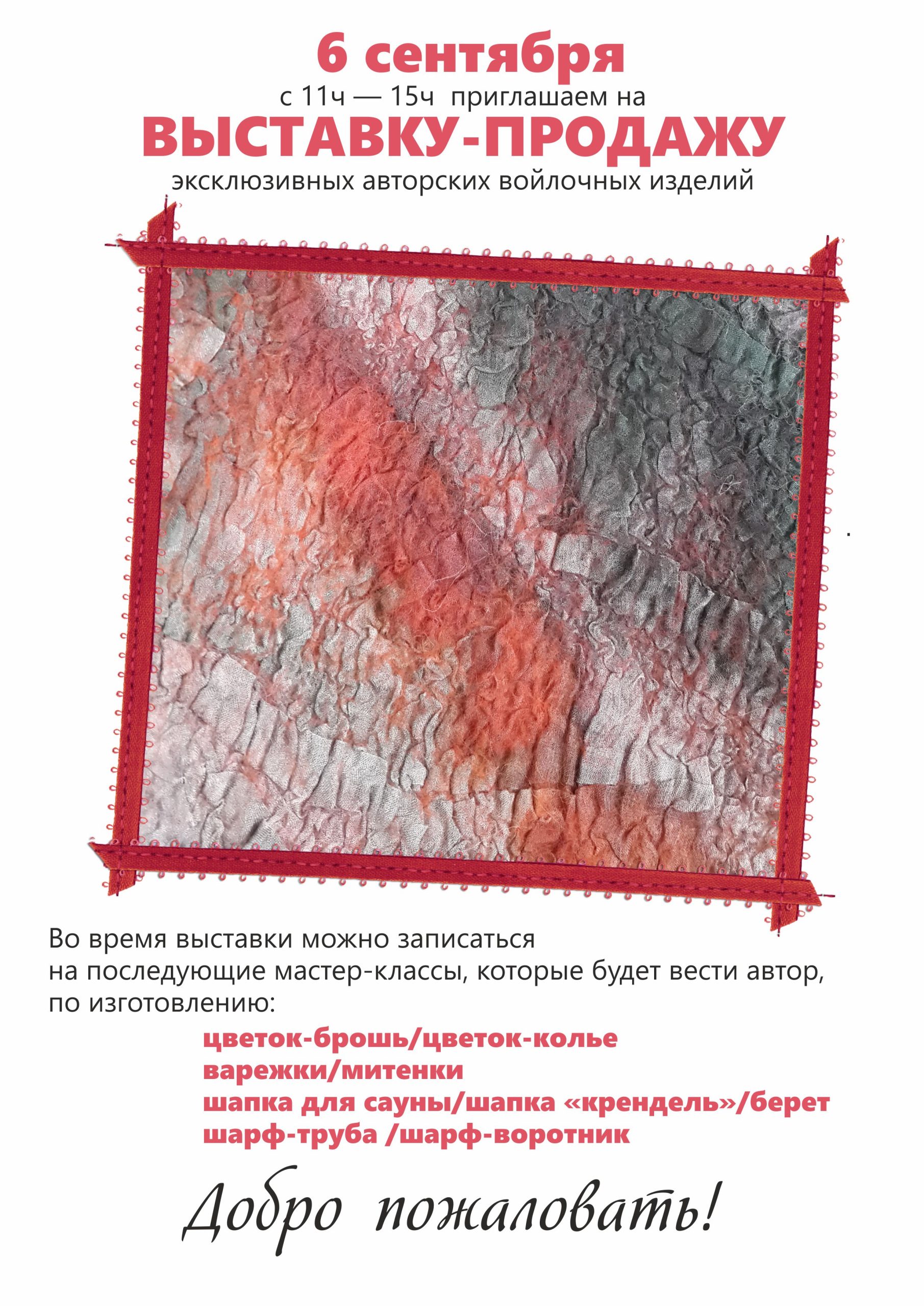 Во вторник 6 сентября в фойе Чайки вы сможете посмотреть, потрогать, примерить красивые изделия из итальянского войлока и шелка. Кто-то возможно захочет их приобрести, а кто-то отважится сделать красоту сам, под руководством опытного мастера по войлоку Елены Клыковой. Не поленитесь, забегите в Чайку во вторник, чтобы своими глазами увидеть войлочные шедевры. Возможно, какие-то изделия вам придутся по душе, и вы сможете записаться на мастер-класс по изготовлению понравившегося вам шерстяного шедевра. и что важно, поговорить с мастером о деталях будущей совместной работы.